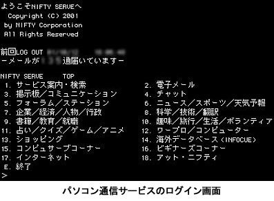 パソコン通信とは、電話回線経由で直接ホストコンピュータに接続し、文字情報のやり取りを行うもの。同社は「NIFTY-Serve(ニフティー・サーブ)」の名称で87年4月15日にサービスを開始。86年にサービスを始めたNECの「PC-VAN(ピーシー・バン)」とともにパソコン通信の2大ホストとして多くの利用者を集め一時代を築いた。90年台後半以降、インターネットが普及するにしたがって競合各社が次々とサービスを終了させていく中、唯一ニフティだけがパソコン通信サービスを継続し続けていた。
