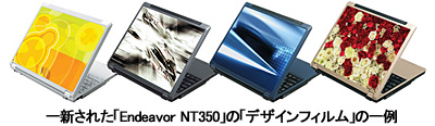 一方、モバイルノートPCの「Endeavor NT350」では、天板部分のデザインフィルム12種類を一新、さらに価格も改定した。「Endeavor NT550」は最小構成旧価格を10万7100円から8万6100円に、「Endeavor NT2850」は最小構成旧価格を8万850円から7万9800円にそれぞれ値下げした。