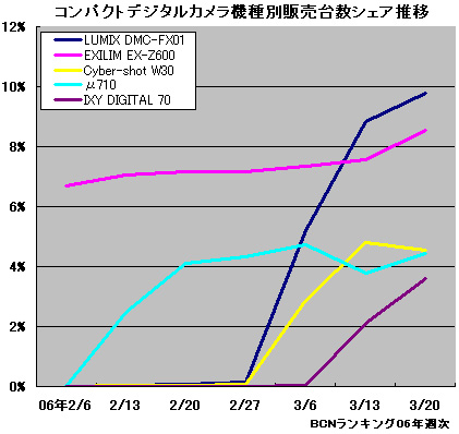 松下の「DMC-FX01」はきわめて力強い立ち上がりを示した。3月10日の発売直後からほぼ「垂直」と呼べる動きで販売を伸ばし、一気にトップを獲得。広告の効果はもとより、大手量販店などでは個別コーナーを設けて力を入れていることも、大きく貢献しているようだ。一方、2位のカシオ「EX-Z600」は、1月27日発売後からほぼ横ばいで安定した売れ行きだが、ここにきてさらにシェアを伸ばしてきた。