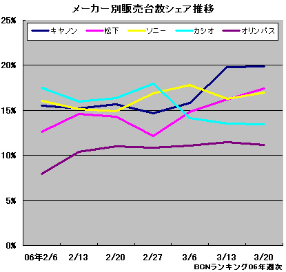メーカー別のシェアはどうだろう。2月から3月にかけての週次の推移を見てみると、3月に入ってキヤノンが1位を獲得。第3週では19.9%のシェアを獲得して混戦から一歩抜け出した。一方、「DMC-FX01」で勢いに乗る松下はシェアを着実に伸ばし3月第3週ではソニーを抜き、シェア17.4%で2位に踊り出た。1位のキヤノンの背中を捕らえ、じわりじわりと接近している格好だ。