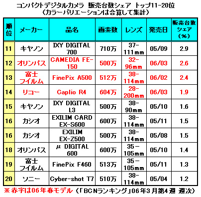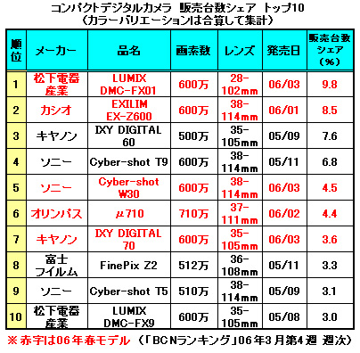 また、2月中旬に発売した6位のオリンパス「μ710」も発売当初は順調な伸びを示したが、松下の「DMC-FX01」に押されてシェアを下げた。しかし、「薄型コンパクトボディのデザインで若者から一定の人気がある」(同)ようで、少しずつ持ち直し始めている。