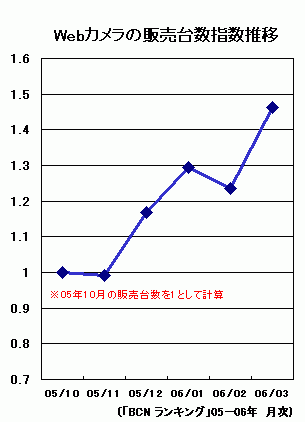 しばらく前なら売り場の片隅にひっそりと陳列されていたWebカメラも、テレビ電話人気を追い風に「出世」を果たし、店頭の目立つところに置かれるようになってきた。それにともないラインアップも充実。デモ機を展示する店も増えてきた。実際この半年間の動向を見ると、売り上げも着実に伸びている。