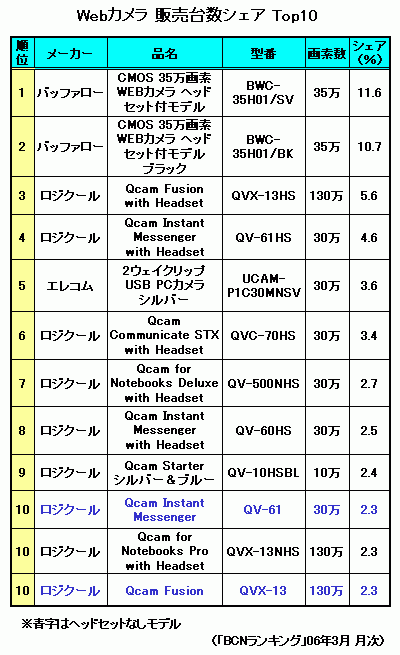 1位、2位を独占したのは、バッファローの「CMOS 35万画素 Webカメラ ヘッドセット付きモデル」のシルバーとブラックのカラーバリエーションモデル。ヘッドセット付き実売で3000円を切る価格帯と性能とのバランスの良さが受けているようだ。3位には、130万画素のロジクール「Qcam Fusion with Headset」が食い込んできた。実売で1万円弱とWebカメラでは高額ながら、表情や顔の動きをキャラクターを使って伝えるなどビデオ特殊機能を盛り込んでいるのも人気。しかし目玉は高画質。ほかにも20位以内にロジクールの130万画素タイプが4機種も入ってきており、主流が130万画素クラスにスイッチする日もそう遠くなさそうだ。4、5位には、ロジクールとエレコムのヘッドセット付き30万画素CMOSタイプがランクインした。
