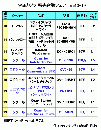 3位には、130万画素のロジクール「Qcam Fusion with Headset」が食い込んできた。実売で1万円弱とWebカメラでは高額ながら、表情や顔の動きをキャラクターを使って伝えるなどビデオ特殊機能を盛り込んでいるのも人気。しかし目玉は高画質。ほかにも20位以内にロジクールの130万画素タイプが4機種も入ってきており、主流が130万画素クラスにスイッチする日もそう遠くなさそうだ。4、5位には、ロジクールとエレコムのヘッドセット付き30万画素CMOSタイプがランクインした。