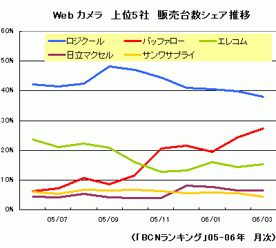 メーカー別のシェアも見ておこう。約4割のシェアでトップをひた走るのはロジクール。このところ各社の参入でややシェアを落とし始めてはいるものの、依然ダントツの強さだ。そこに待ったをかけるべく急激にシェアを伸ばしているのがバッファローだ。機種別でトップの「BWC?35H01/SV CMOS 35万画素 Webカメラ ヘッドセット付きモデル」がメーカーシェアを押し上げている。