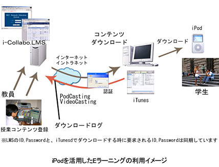 NECは、アップルコンピュータのiPodを使って学ぶことができるEラーニングシステムを開発し、5月5日から教育機関向けに販売を開始した。動画や音声による教育コンテンツをポッドキャスティングを使って配信するシステムで、学生は手持ちのiPodにコンテンツをダウンロードして閲覧する。