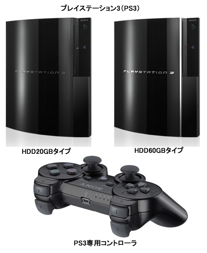 PS3はドライブに読み出し専用のブルーレイディスク(BD)を搭載。さらにCPUに、ソニーが米IBM、東芝と開発した「Cell(セル)」を採用したのが特徴。BDの規格で規定する、毎秒48メガビットの最高ビットレートのディスク再生ができる。読み込み速度はBDで2倍、DVDが8倍、CDが24倍、スーパーオーディオCDが2倍。ギガビットイーサネットとHDDも装備しており、ネットワークを使ってコンテンツをダウンロードしたりオンラインゲームを楽しんだりすることができる。通常のテレビに加え、フルHD(ハイビジョン)ディスプレイにも接続可能。また、徹底的な廃熱・静音対策を施すことでPS2並の静音性も確保した。サイズは幅25×高さ98×奥行き274mm、重さは約5kg。本体カラーはクリアブラック。