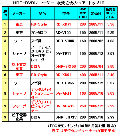 一方、ランキングに目を戻すと、4月に発売した松下電器産業の「DMR-EX150」が早くも5位に顔を出しており、今後は春モデルの動向が注目される。