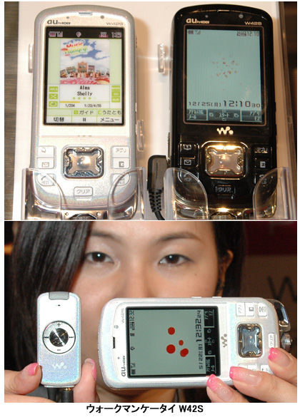 ソニーが開発した携帯電話端末「ウォークマンケータイ W42S」は「着うたフル」、携帯とPC連携型の音楽配信サービス「LISMO(リスモ)」に対応する。音楽データ専用メモリを1GB内蔵しており、最大630曲を保存が可能。新開発の半導体を搭載し、音楽再生時間が30時間とauの従来機よりも約4倍に伸ばした。