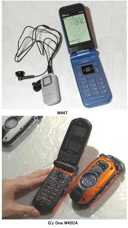 そのほかにも、Bluetoothでワイヤレスで音楽を楽しめる1GBメモリ内蔵の東芝製「W44T」や耐水・耐衝撃性が特徴のカシオ製「G'z One W42CA」、携帯機器向け地上デジタル放送「ワンセグ」が視聴できる三洋電機製「W33SAII」など6機種も発表した。