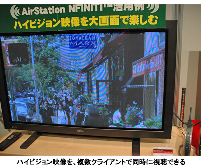 発表会場では、1台のルータから複数のクライアントに向けてハイビジョン映像(20Mbps)を送り出すデモンストレーションを実施。IEEE802.11g規格の無線LANルータでは同時に2つのクライアントに接続しただけで映像に乱れが生じたが、NFINITIシリーズの無線LANルータではプラズマテレビ2台とプロジェクタといった3クライアントに同時接続した状態でもスムーズに視聴できた。