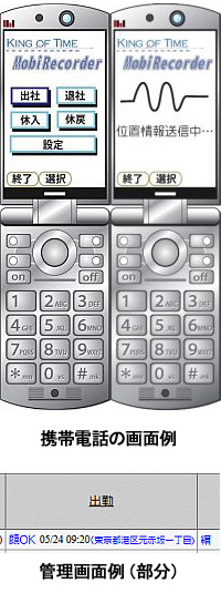 ヒューマンテクノロジーズ(ヒューマンテクノ、藤村高寛社長)は6月6日、携帯電話のGPSによる位置情報機能と顔認証を組み合わせたモバイル勤怠管理システム「King of Time モビレコーダー」を6月15日に発売すると発表した。au携帯電話向けのシステムで、対応機種は「W41H」と「W41CA」。