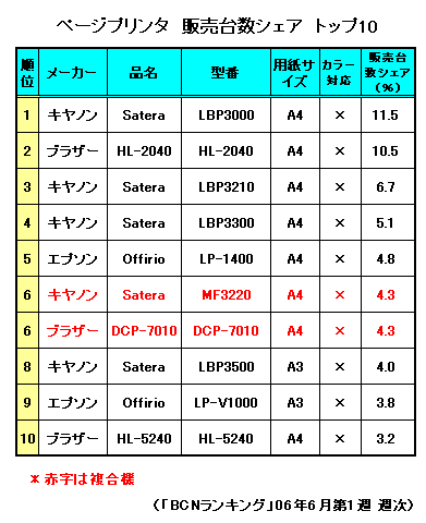 機種別の直近データを見てみよう。「BCNランキング」06年6月第1週(5月29日-6月4日)では、キヤノンの「LBP3000」が販売台数シェア11.5%で1位を獲得。小型・軽量を追求した低価格モデルで、小型・モノクロ高速エンジンを搭載し、A4サイズで毎分14枚の出力を実現したモデル。2400dpi相当×600dpiの高精細画質ながら、幅369.8×奥行き250.5mmの省スペース設計を実現したのが特徴だ。また、2位はブラザーの「HL-2040」でシェア10.5%。1、2位ともに05年3月発売で、実売が1万円台の定番人気機種だ。