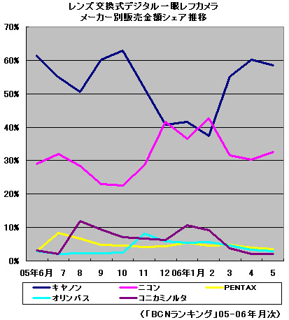 現在、国内のデジタル一眼レフ市場は、キヤノンとニコンの2大メーカーが牛耳っている。販売金額シェアの推移でみると、キヤノンは平均で50%以上、ニコンも30%以上のシェアを維持し続けている。直近の5月の数字ではキヤノン58.5%、ニコン32.7%と、この2社だけで実に9割を超えている状況。ソニーと松下は、この市場で戦いを挑むことになるわけだ。しかし、それぞれまったく異なる戦略で立ち向かおうとしている。