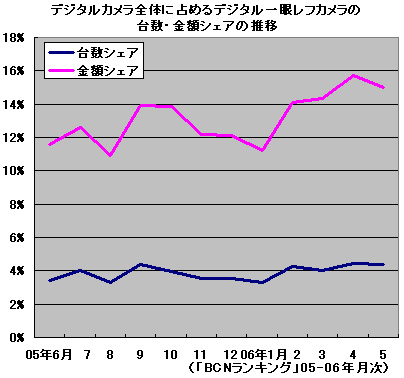 デジタル一眼市場の魅力は他にもある。付加価値の高さ、つまり価格の高さだ。販売台数と金額について、デジカメ市場全体に占めるデジタル一眼のシェアを比べてみた。前述したとおり、デジタル一眼がデジカメ市場全体に占める台数の割合は4.4%とまだまだ少ない。しかし、販売金額シェアでは、今年に入って15%にまで伸びてきている。