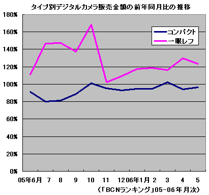 数字でみてみよう。「BCNランキング」で販売金額の前年同月比推移をみてると一目瞭然。このところ前年割れの月がちらほらみられるコンパクトデジカメを尻目に、デジタル一眼は若干上下にブレながらも、一貫して右肩上がりを続けている。この5月には前年比20%増の伸びを示しており、トレンドはまだ市場拡大の方向に向かっているといえそうだ。