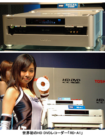 東芝は、HDD-DVDレコーダーに搭載しているGUI・多機能ソフトつき画像処理回路「RDエンジンHD」を「HD DVD対応版」に改良。録画したHD番組をフレーム単位で編集してプレイリストを作成、HD DVDディスクにダビングすることもできる。従来のDVDの記録・再生も可能で、過去に録画した複数のDVDをHDDにダビングし、劣化することなく1枚のHD DVDにダビングしなおすこともできる。対応メディアは、内蔵HDD、HD DVD-Video、HD DVD-R、HD DVD-R DL、DVD-R、DVD-R DL、DVD-RAM、DVD-RW、DVD-Video、音楽CD、CD-R/RW。録画方式は「MPEG2」のみ。
