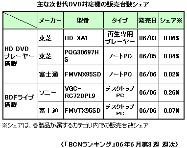 東芝によれば、3月に発売したHD DVDプレーヤー「HD-XA1」については、米国で2万台程度の販売実績があるものの、国内ではあまり台数が出ていないとしている。「BCNランキング」で直近の6月第3週の主な次世代DVD対応機(表)を見てみると、シェアとしてはまだまだといったところだが、ラインアップが出揃ってくることでも相乗効果を期待したい。また、4月まで前年割れを続けてきたDVDレコーダーだが、デジタルチューナー対応機種への買い替えと、ワールドカップ効果で5月には前年比プラスに転じている(図)。次世代を担うHD DVDレコーダーがDVDレコーダーの復調の起爆剤となるかどうかが注目される。