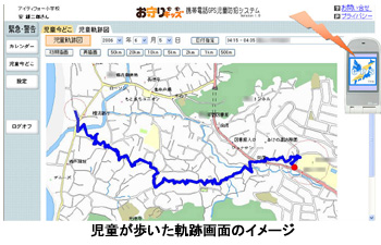 児童の位置情報は6秒ごとに児童が持つ携帯電話内に蓄積。3分間の蓄積データが3分ごとに専用のサーバーへ送信される。児童が歩いたルートは3分ごとに軌跡として専用サイトの地図上に青色の線で表示されていき、PCからインターネット経由で確認できる。