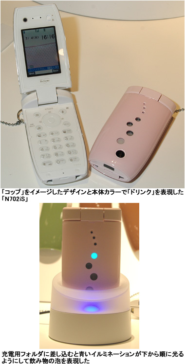 「N702iS」は、デザインで「コップ」、カラーで「ドリンク」を表現。背面に飲み物の水泡をイメージした穴を設け、それぞれの穴にカメラやカメラ用ライト、スピーカー、背面表示用ディスプレイなどの機能を割り当てた。イタリアの家具メーカー、カッペリーニ社でも活躍した佐藤オオキ氏がデザインを担当した。本体に加速度センサーを内蔵。端末の傾きに合わせ、待ち受け画面が液体のように揺らいだり、振ることで目覚まし時計を止めることなどができる。充電用機に端末を差し込むとカメラライトとディスプレイ部分が下から順に青く光り、ドリンクの泡がコップに浮かぶような様子を再現する、といった遊び心も盛り込んだ。