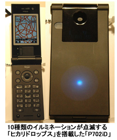 「P702iD」は、端末のサイドキーを押すと端末の背面にキャンドルの炎や線香花火、ルーレットなどをイメージした10種類のイルミネーションが点滅する「ヒカリドロップス」を装備。通話する相手の声を分析し、「喜び」「怒り」などの感情を45種類のアニメーションと14パターンのイルミネーションで表示する「Feel Talk(フィールトーク)」機能も備えた。「着うたフル」にも対応する。端末の角が直角の「エッジタイプ」と丸みを帯びた「ラウンドタイプ」の2つのバリエーションがある。デザインはグラフィックデザイナーの佐藤卓氏が担当した。