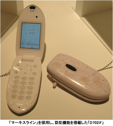 「D702iF」は、ファッションデザイナーの幾田桃子さんがデザインを担当した。女性の指先を美しく見せる宝石のカット方法「マーキスライン」を模した形と曲線が特徴。メモキーを押すとメロディを再生し、着信したようにカモフラージュする「ほっとメロディ」機能も搭載する。夜道を歩きながら背後の人影に不安を感じた場合などに音を鳴らし、周囲の注意を引き付けるといった防犯機能的な使い方もできる。