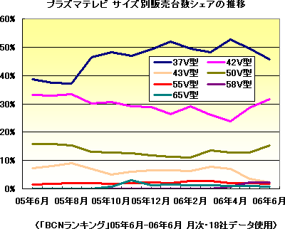 そのなかで、プラズマテレビのサイズ別販売台数シェアの推移を見ると、それまで順調に販売を伸ばしてきた37V型は06年4月の52.6%をピークに6月には45.7%までシェアを下げている(「BCNランキング」)。