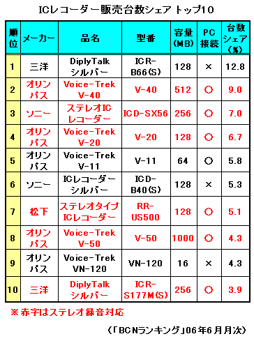 「BCNランキング」6月の販売台数シェアで、ICレコーダーの人気モデルトップ10を見てみよう。1位を獲得したのは、三洋電機の「ICR-B66(S)」で、シェア12.8%。128MBフラッシュメモリを内蔵し、最長約72時間録音できるモデルだ。高感度指向性マイクが付属。ヘッドが可動式になっており、音の方向にマイク向けやすくなっている。録音形式はモノラルのみで、パソコンには接続できないが、実売で1万円を切る価格が魅力のようだ。