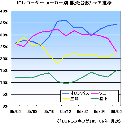 ここで、メーカー別の販売台数シェアの推移を見ておこう。05年の6月時点では、オリンパスとソニーが同率で1位、僅差で三洋が3位、かなり離れて松下が4位で追いかけるという形だった。その後、抜きつ抜かれつの1位・2位争いを繰り広げたのはオリンパスとソニー。激しいデッドヒートの末、6月時点では、オリンパスが頭一つ抜けた形で、34.4%のシェアを獲得。トップの座についている。逆にソニーは、5月にボイス録音・MP3音楽再生・データストレージ機能を搭載した1台3役の新製品をリリースする予定だったが、発売を延期。こうしたことが響いてか、5・6月で大きくシェアを落とした。23.1%とかろうじて2位の座は守っているものの、背後に三洋が22.3%で迫っている。さらに10%前後で推移してた松下も、ここにきて15%までシェアを伸ばしており、上位陣に食い込もうとしている状況だ。