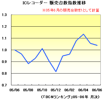 05年6月を1とするICレコーダーの販売台数指数の動きを見ると、販売のピークは4月と9月の2回。新学期のシーズンだ。語学学習などで利用されるケースが多いようだ。販売台数の前年同月比を見ると6月時点で4%増。販売台数指数の動きを見ても、緩やかな右肩上がりになっている。今年から大学入試センター試験で英語のリスニングが開始されたこともあり、語学学習用途での購入もこれからさらに増えそうだ。