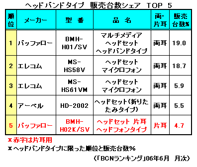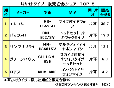 また、携帯に便利な「耳かけタイプ」は全体の20.2%。ヘッドバンドタイプと比べ、軽く、小さいので、ネットカフェや街角の無線スポットといった移動先でIP電話を利用する場合に便利だ。ヘッドバンドと同様に両耳用、片耳用があるが、こちらは9割が片耳用。全体でも3位になったエレコム製「MS-HS59SC」が「耳かけタイプ」の1位で、「耳かけタイプ」に限ったシェアは30.7%だった。このほか、首の後ろ側に装着するネックバンドタイプが16.6%、耳栓タイプが4.3%という結果になった。