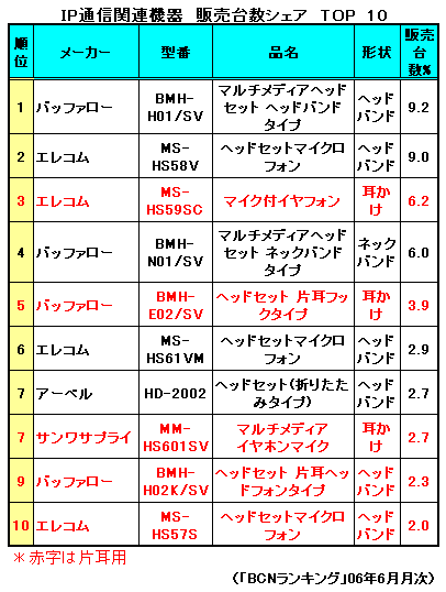 ヘッドセットが売れている。「BCNランキング」で「IP関連通信機器」に分類されているのが、主にIP電話などで利用するヘッドセットなどの販売動向。この販売台数伸び率が6月の前年同月比で34%増と好調だ。店頭でも専用コーナーが設置されはじめている。そこで、「BCNランキング」からPC用のヘッドセットを中心とした関連機器の売れ筋と傾向を探ってみた。