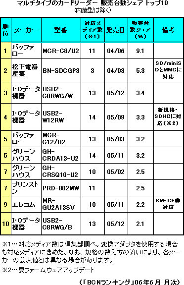なお「BCNランキング」には、デスクトップPCにメモリカードスロットを増設するための「内蔵」タイプもあるが、一般的なカードリーダーとは若干異なる製品であるため、今回の集計からは除外した。