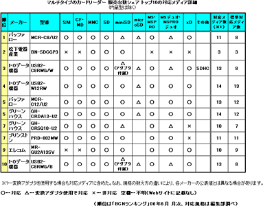 調査の結果、対応メディアの総数は、ほぼすべての規格を網羅しているといえる「13」が3製品、「14」「11」「10」がそれぞれ2製品と同数で並んだ。対応するメディア規格別では、上位10位すべてが「SD」をサポートする一方、スマートメディアやコンパクトフラッシュなど、採用機種が限られる規格は9位のエレコム「MR-GU2A13SV」のように対応しないものも現れた。比較的登場の新しいxD-ピクチャーカードも製品によって対応が分かれる。