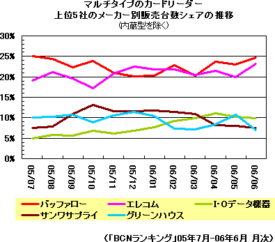 メーカー別では、20%超のシェアで拮抗する1位バッファローと2位エレコムがきわどい戦いを続けている。10%前後の水準で争う第2集団はI・Oデータ、サンワサプライ、グリーンハウスという状況。ここでの注目はI・Oデータ。05年6月時点では5.0%だったが、この1年でシェアを倍増させ、06年4月には10%の大台を超えた。6月はシェアを落としたが、9.9%でバッファローとエレコムの1位グループに続いて3位につけている。同社では、この躍進の理由について、3位と10位に入った同社のフラグシップモデル「USB2-C8RW」シリーズの好調が要因と分析している。