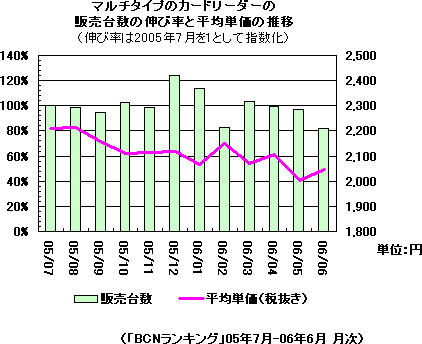 しかし、メモリカードの規格がほぼ出揃っている現状を反映してか、カードリーダーの売れ行きは足踏み状態。1年間の販売台数の推移を見ると、若干の増減はあるもののほとんど横ばいだ。平均単価はやや右肩下がりだが、税抜き2000-2200円程度でほぼ下げ止まったように感じられる。
