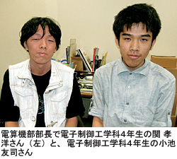 競技部門に出場するチームのリーダーは、情報工学系サークル「電算機部」部長を務める電子制御工学科4年生の関孝洋さん。同級生で電算機部メンバーの小池友司さんとともに参加する。プログラミングやマルチメディアの優れた技術を持つ精鋭メンバーを揃え、「総力を挙げて競技に臨む」(関さん)構えだ。