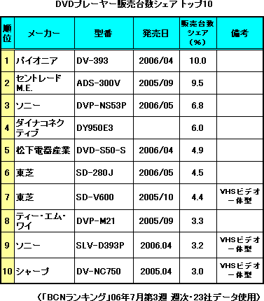 「BCNランキング」7月第3週(06年7月10日-7月16日)のDVDプレーヤー販売台数シェア1位はパイオニアの「DV-393」が獲得。2位はセントレードM.E.の「ADS-300V」で、1位にわずか0.5ポイント及ばなかった。前週(06年7月3日-7月9日)は「ADS-300V」が1位で、「DV-393」が2位。その前の週は「DV-393」が初の1位に輝き、「ADS-300V」の連続1位記録にストップをかけた。どちらも家庭のAV機器の「セカンド」ポジションを狙う低価格なプレーヤー。しかし、その方向性はやや異なる。