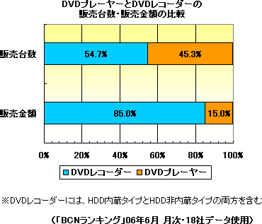 DVDプレーヤーとDVDレコーダーの販売動向を「BCNランキング」で比べてみると、台数はDVDレコーダーがやや多く、金額では単価の多いDVDレコーダーが圧倒的に上回る。06年6月の前年比は、DVDプレーヤーは台数が97.4%、金額が96.1%で前年割れ、DVDレコーダーはワールドカップ効果か、台数は106.9%、金額は120.7%と大きく伸びた。そのうち約6割近い57.5%が、デジタルチューナーを搭載したデジタル放送対応モデル。DVDプレーヤーのコピーワンスへの対応はすでに2、3年前から始まっていたが、安価なプレーヤーでは今ひとつ対応が遅れていた。