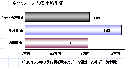 BCN(奥田喜久男社長)は8月1日、都内で会見を開き、「BCNランキング」で分析した「ネット販売の意外な素顔」について発表した。一見「安い」と思われがちなネット販売だが、購入単価はネット販売が店頭を上回る。平均単価はネットが1万6300円、店頭が1万600円でネットのほうが約6000円高い。PC・デジタル家電関連115品目のうち、70品目でネットの購入単価が店頭より高いという実態が明らかになった。