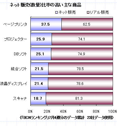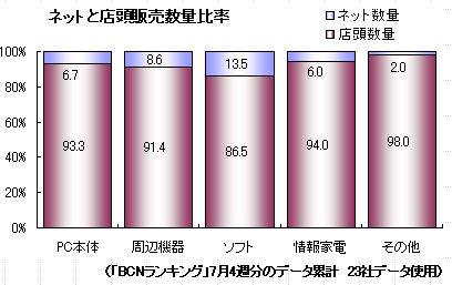 また、ネット販売の割合が台数よりも金額で高いことについては「ネット販売では単価が店頭よりも高いため、金額が占める割合が高くなっている。製品では、ソフトウェア、周辺機器などの販売比率が高いが、これまでネット販売向けと思われていなかった情報家電なども(ネット販売で)よく売れている」(同)と解説した。