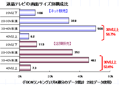 ネットショップでの購入単価が高い要因として、BCNの田中繁廣取締役は、「同一商品ならネットの単価は店頭より最大で2割程度安い。価格が安いためにワンランク上の高機能商品が売れる傾向にある」と分析。さらに、HDD-DVDレコーダーや液晶テレビなど成長分野の商品では、店頭よりも大容量・大型といった先端型商品の販売比率が高いほか、企業向けの比較的高価な業務用商品が売り上げを伸ばしている点を指摘した。