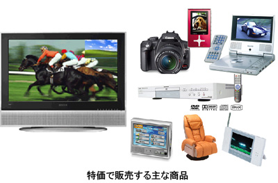 対象商品は、ゾックスの160GB/250GBのHDD-DVDレコーダー「ZTO-4101/4102」、三洋電機のポータブルカーナビ、ポータブルDVDプレーヤー、ワーテックスのお風呂テレビ、オムロンのマッサージチェア、キヤノンのデジタル一眼レフカメラ「EOS Kiss digital」、I・Oデータの120GBポータブルHDD、32型液晶テレビ、東芝の携帯オーディオ「gigabeat S30」、日本HPのプロジェクター。