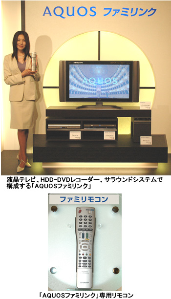 シャープは8月2日、液晶テレビ「AQUOS(アクオス)」とDVDレコーダー「AQUOSハイビジョンレコーダー」、ラック型サラウンドシステムを専用リモコン1つで操作するシステム「AQUOSファミリンク」を開発、対応する「AQUOS」とHDD-DVDレコーダー、サラウンドシステムを9月1日から順次発売すると発表した。価格はすべてオープン。