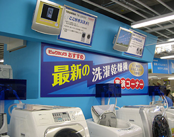 また、ビックカメラ初の試みとして、店舗内に給排水設備を引き、洗濯機など生活家電を実際に使ってみることができる「実演コーナー」を設置。また、各フロアに「今と昔」と題したインフォメーションパネルを用意した。これは、たとえばデジタルカメラの場合、昔の機種と比べて、最新機種の方が電池の持ちが良い、広角まで撮影できる、動画がきれい、本体がスリムといった「進化点」を写真やグラフ・表などを使って示すもの。一目で違いが理解できるよう、わかりやすく解説するなどして、買い替え需要を刺激する。