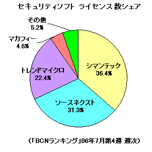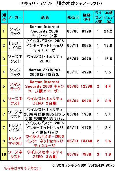 まず「BCNランキング」06年7月第4週(7月24日-7月30日)のデータで売れ筋を見てみよう。1位がシマンテックの「Norton Internet Security 2006 キャンペーン版」で販売本数シェアは26.3%。発売以降トップ走り続けている人気ソフトが今週も1位を獲得した。キャンペーン版とは、同社が10月末まで展開している、ワンセグチューナー搭載DVDプレーヤーやスーパーマングッズが当たる、というキャンペーンパッケージ。ウイルス/スパイウェア対策ソフト「ノートン・アンチウイルス」と不正侵入や個人情報の流出を防止する「ノートン・パーソナルファイアウォール」を組み合わせた製品だ。2位はトレンドマイクロの「ウイルスバスター2006 インターネットセキュリティ 1ユーザ」で、シェアは17.2%。こちらも人気の定番商品だ。フィッシング詐欺対策のほか、ファイル交換ソフトWinnyを介して感染を広げるコンピュータウイルス「Antinny(アンティニー)」にも対応した総合ウイルス対策を盛り込んでいる。