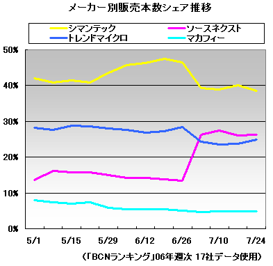 ここで、メーカー別の販売本数シェアの推移を見てみよう。これまで、比較的安定していたメーカーの力関係が大きく変わってきた。シマンテックのトップは変わらないものの、以前は45%強あった販売本数シェアが「ウイルスセキュリティZERO」の発売週には38.6%に下落。一方、これまでシェア14%前後でシェア3位だったソースネクストは27.5%にシェアを大きく伸ばし、トレンドマイクロを抜いて2位にまで急上昇。そのトレンドマイクロも、一旦シェアを落としたがじわじわとシェアを回復しつつある。7月第4週のデータでは、シマンテックが38.3%、ソースネクストが26.7%、トレンドマイクロがシェア24.3%と上位3社の差は徐々に縮まってきた。