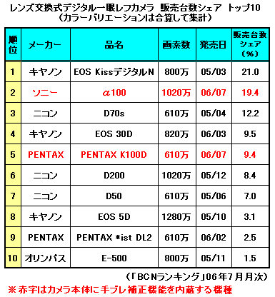 つまり、ソニーが2強の、特にキヤノンのシェアをかなり「食った」ことがわかる。また、PENTAXも「PENTAX K100D」で6月の7.6%から7月は14%と、ほぼ倍にシェアを拡大しており、キヤノン、ニコンはこちらにもシェアを奪われた格好だ。当初、ソニーや松下の参入でデジタル一眼レフカメラのユーザー層が広がり、市場そのものの拡大も期待されたが、こうした「食い合い」動きを見る限り、まだ「パイ拡大」効果は出ておらず、いっそうの競争の激化を生んでいるようだ。