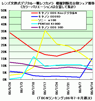 その勢いで直撃されたのがキヤノンの「EOS KissデジタルN」。この期間、対照的に大きくシェアを落としている。6月には30%以上のシェアを保持していたが、「α100」人気で7月には大幅にシェアを落とした。しかし、8月に入って「α100」の購入が一段落したことで、再び販売戦台数を回復してきた。