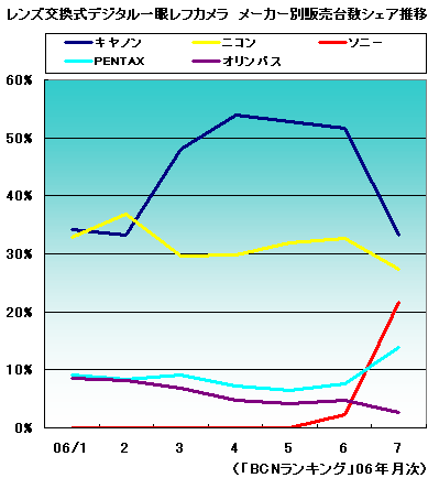 ソニーはデジタル一眼参入直後の7月に21.6%と「α100」でいきなり第3位のシェアを獲得。一方、キヤノンは4月の54%を頂点に6月まで常に50%以上のシェアを獲得してきたが7月には33%と大きく落ち込んだ。ニコンも3月以降、30%台のシェアを保持してきたが、7月には27.4%と3割を切った。